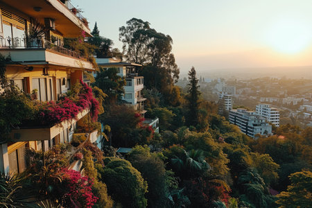 Capture the serene beauty of a hillside at sunset, where evergreen trees bask in warm light, creating a peaceful atmosphere and showcasing nature's splendor.