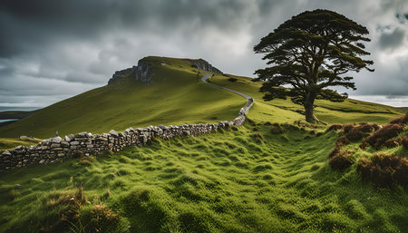 A picturesque scene showcasing a rolling green hill, a stone wall snaking along its base, and a majestic tree standing tall against a backdrop of cloudy skies. The scene exudes a sense of tranquility and natural beauty.