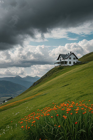 Lonely house on the hillside with flowers and cloudy sky