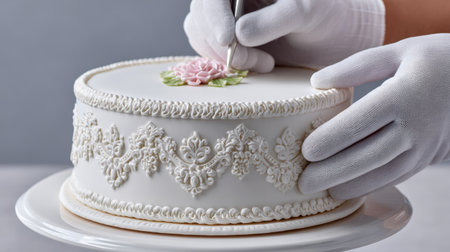A talented artisan decorates a beautifully crafted cake, showcasing intricate floral designs and delicate frosting techniques with precision tools.