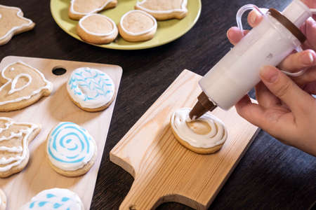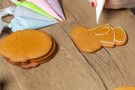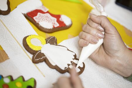 Decorating Christmas gingerbread with icing. Girl holds pastry bag with white icing and decorates gingerbread