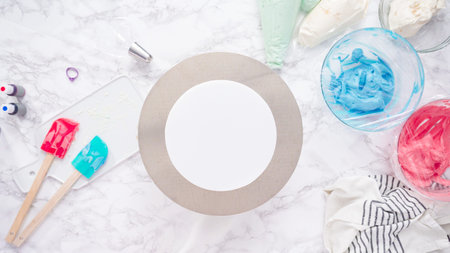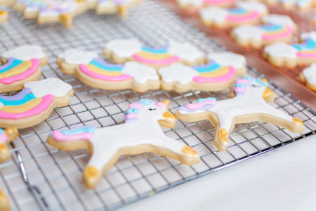 Flat lay. Decorating unicorn sugar cookies with multi-color royal icing.