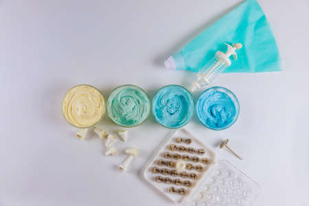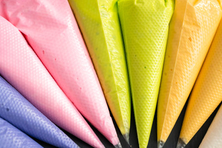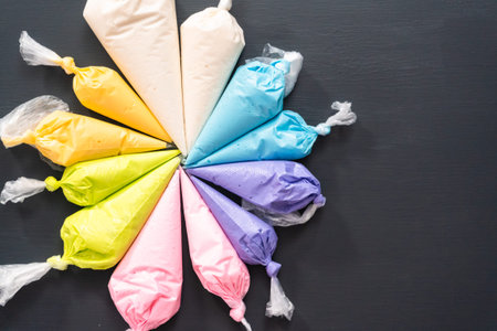 Flat lay. Variety of colors of royal icing in plastic piping bags.