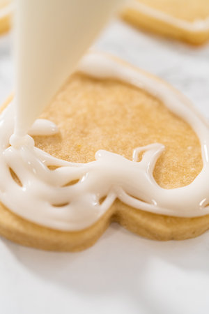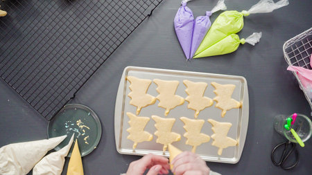 Step by step. Decorating gingerbread and sugar cookies with royal icing for Christmas.