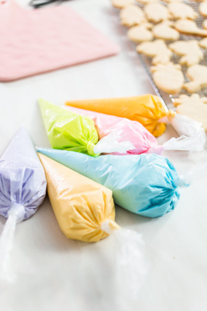 Piping bags with pastel color royal icing to decorate Easter sugar cookies.