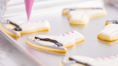 Flat lay. Icing figure skate shaped sugar cookies with royal icing.