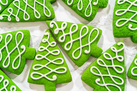 A detailed view of the white icing designs on green Christmas tree cookies, focusing on the intricate swirl patterns.