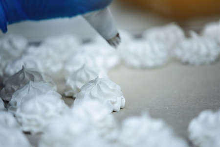 The process of making meringue and desserts. A gloved hand squeezes the cream. Production of confectionery