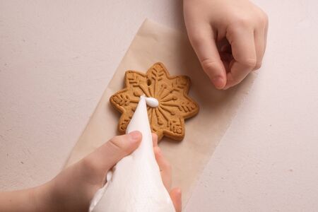 Baking holiday cookies. The child decorates homemade gingerbread in the form of a snowflake with white and green glaze. Christmas Treats.