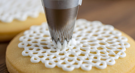 An extreme close-up macro shot of a piping bag tip meticulously applying white royal icing onto a sugar cookie. The baker is creating a delicate and intricate lace pattern, showcasing precision and baking artistry.