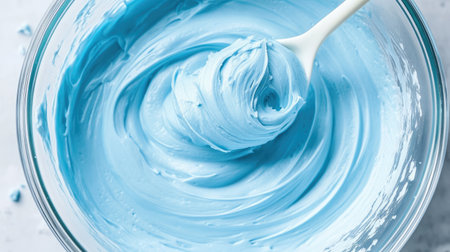 A vibrant blue frosting swirls elegantly in a glass mixing bowl, perfect for cake decoration or delightful baking projects, highlighting creamy texture.