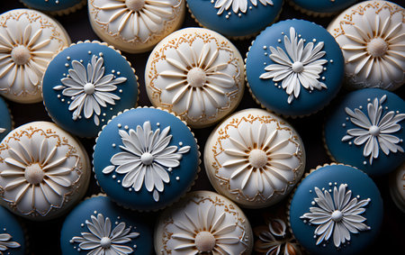 Blue cupcakes decorated with white flowers. Top view. Toned.