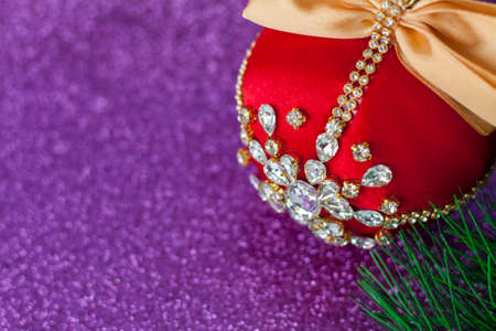 Red Christmas ball in rhinestones for Christmas tree decoration. Christmas toy. Christmas toy for decorating a Christmas tree on a lilac background. Shining crystals on a red ball. Christmas and new year.