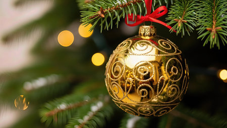 Close-up of a gold Christmas ornament, adorned with glitter, hanging on a decorated Christmas tree. Warm, festive lighting creates a magical atmosphere.