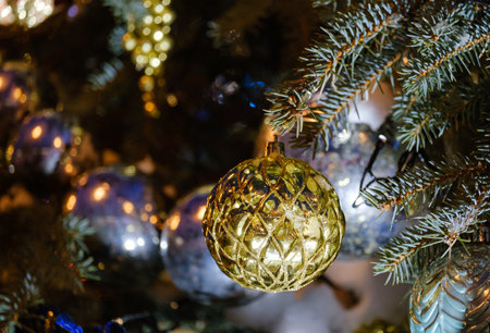 Gold bauble among chistmas tree brenches. Closeup look of the ball
