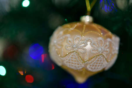 Gold festive glass ball with colored sparkles, snowflake on the Christmas tree and beautiful yellow bokeh of glowing garland.