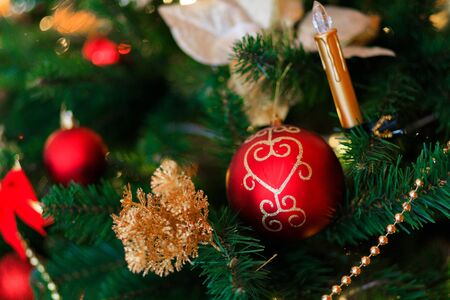 Christmas tree with Christmas decorations is indoor shooting close-up