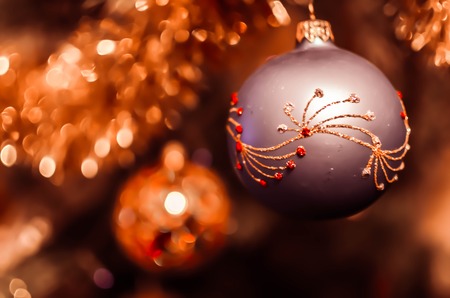 Closeup of Christmas tree decorations. Selective focus with retro faded colors