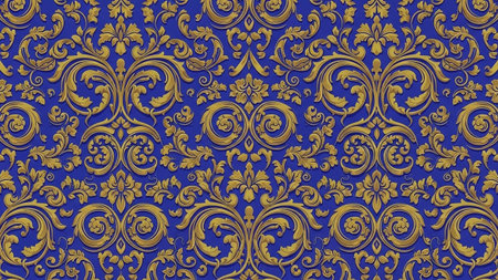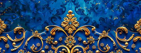 showcases an elaborate baroque pattern in rich gold against a textured royal blue background. The is characterized by intricate scrollwork, swirling filigree, and floral creating a sense of depth and opulence. The repeating motifs form a decorative and surface, backgrounds or decorative applications.