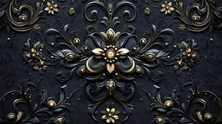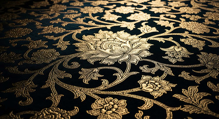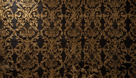 Intricate baroque patterns embossed in gold on a black velvet surface, radiating royal elegance and vintage luxury
