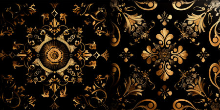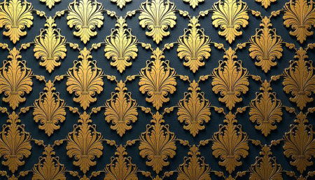 Seamless gold floral damask pattern repeating on a dark background, creating an elegant and luxurious design. Ai generated image
