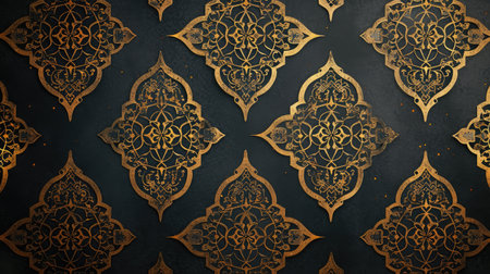 Exquisite gold Islamic patterns adorn a dark textured backdrop, exuding elegance. Islamic Arabic Arabesque Ornament Border Luxury Abstract black Background with Copy Space