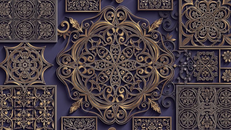A collection of ornate golden mandala and geometric patterns are arranged on a deep purple background, showcasing intricate details and symmetrical designs.