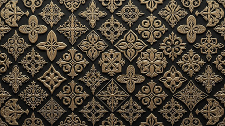 Ornate golden floral medallions are set within dark diamond-shaped frames on a textured background, evoking richness and historical grandeur.