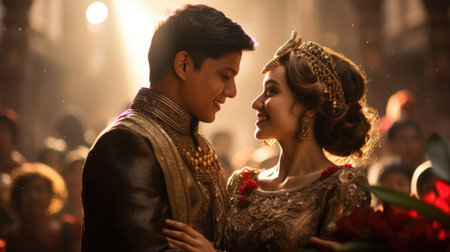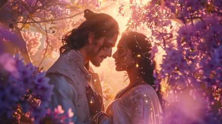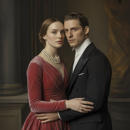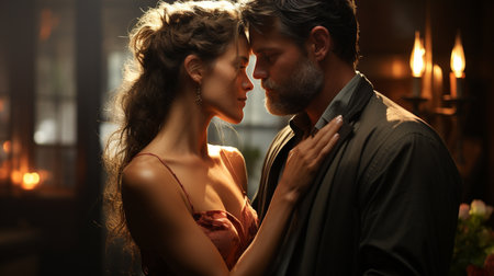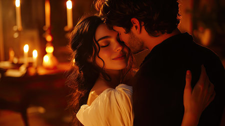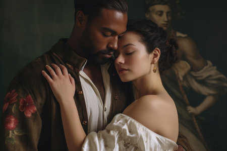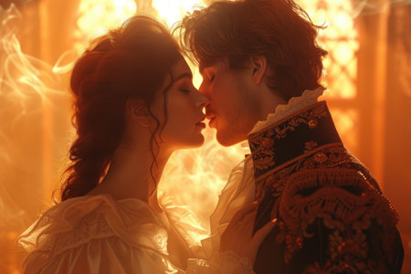 Capturing passion in the renaissance, Victorian, and baroque era: a timeless love story portrayed by a couple in vintage attire, embracing the elegance, romance, and nostalgia of historical periods