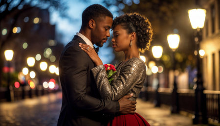 Elegant African American couple in formal attire sharing tender moment on illuminated city street. Perfect for romance, dating, anniversary, and relationship marketing campaigns.