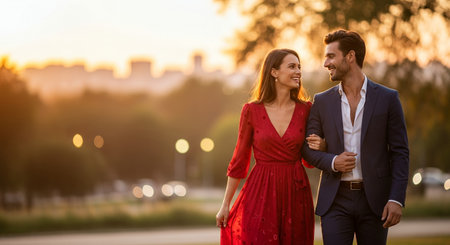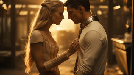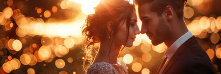 Close-up of a pair standing together, their features illuminated by the sun's embrace. AI generative.