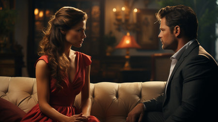panoramic shot of beautiful elegant sexy couple of lovers sitting on bed in dark room