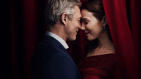 Mature couple sharing an affectionate moment nose to nose, dressed in sophisticated evening attire, celebrating love and romance