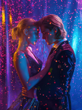 Young couple in love standing in a dimly lit room. Prom king and queen. Surrounded by vibrant purple and blue neon light, sprinkles, splashes, glitters and sparkles.