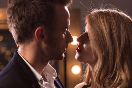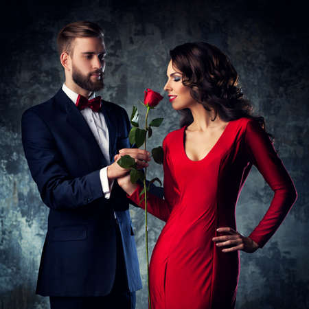 Young elegant couple in evening dress portrait. Woman in red sniff rose. Focus on woman.