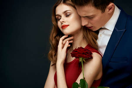 portrait of romantic couple in love with red rose on isolated background and classic suit evening dress