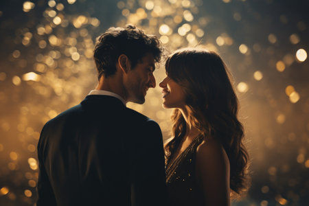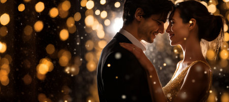 A man and a woman standing together, side by side, in a straightforward and unembellished manner, Man and woman at a Christmas party in gold color, Bokeh light, AI Generated