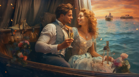 Generative AI : Young couple in love on sail boat drinking champagne Happy exclusive luxury concept