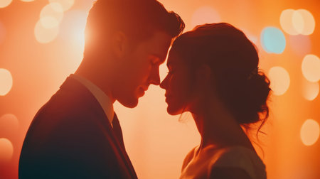 Romantic Silhouette of Couple Embracing Against Vibrant Sunset Bokeh Background.
