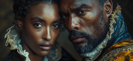 Portrait of African man and woman, wearing richly detailed renaissance costumes. Dark background. Medieval royal family