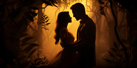 Silhouetted couple cozily nestled amidst foliage illuminated by golden backlight. Concept Romantic Silhouette, Golden Hour, Foliage Backdrop, Cozy Couple, Illuminated Love