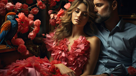 Portrait of a beautiful young couple in love. A man and a woman on a background of red flowers.