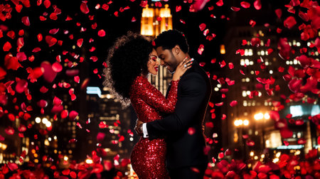Couple embracing warmly amidst falling rose petals. Nighttime city backdrop with bright skyline adds to the romantic atmosphere. Concept of love, relationships, weddings.