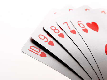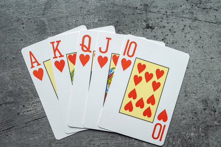 Closeup of heart royal flush the highest ranking hand in hold'em poker in horizontal view
