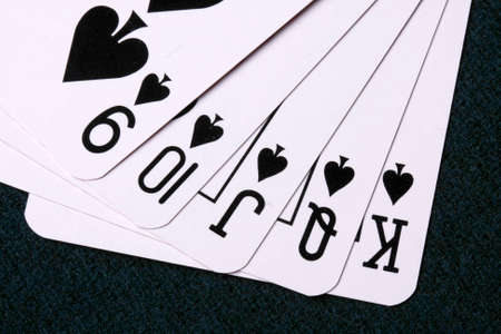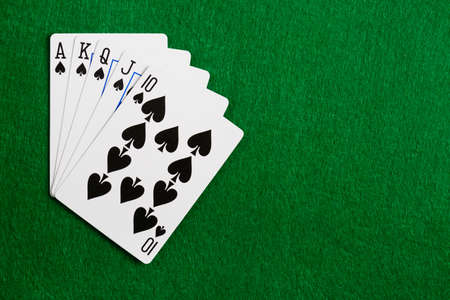 Royal Flush poker card sequence on a green table. Risky entertainment of gambling