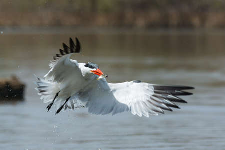 A wet Caspian Tern Sterna Caspia flying over water
