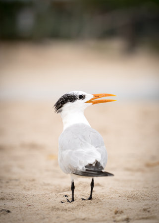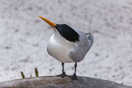 royal tern (Thalasseus maximus) stands on sand by the shore, Florida, USA