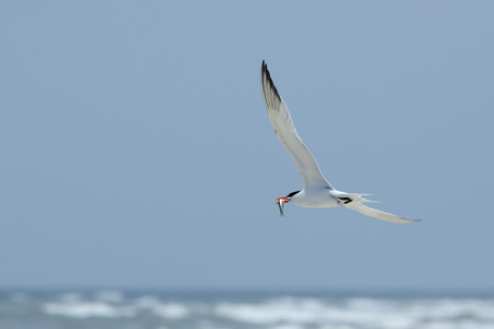 Royal tern flying with a fish