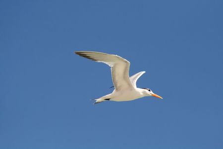 Flying royal tern Thalasseus maximus on the white sands of Clam Pass in Naples, Florida.