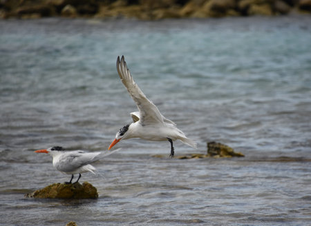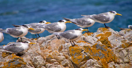 Royal Terns Facing The Wind Together on rocky shoreline